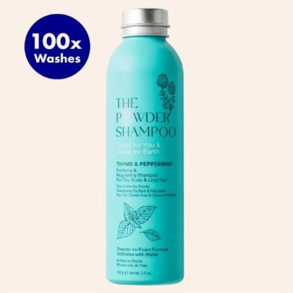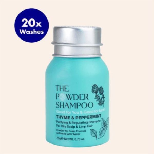The image shows The Powder Shampoo for Oily Scalp & Limp Hair, a powder-to-foam shampoo designed to purify and regulate sebum production. It is formulated with thyme, peppermint, and papaya enzyme. This shampoo is designed to be eco-friendly, with recyclable packaging and a waterless formula.